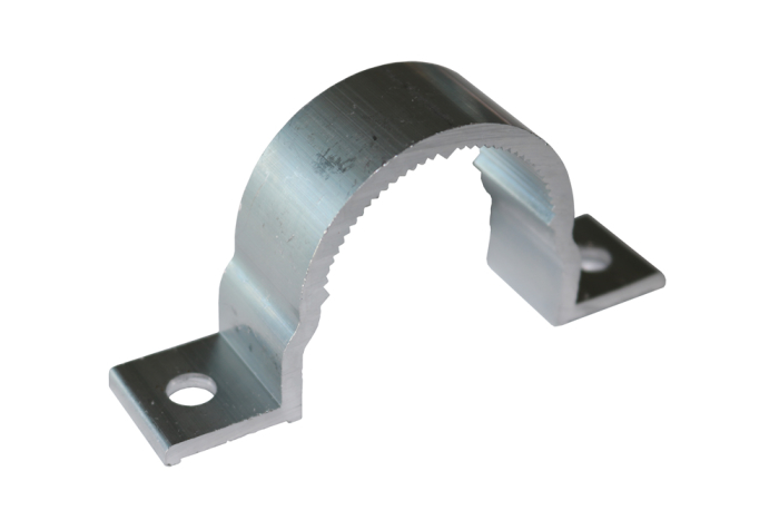 Abraçadeira em alumínio para fixação dos perfis de sinalização a estruturas construídas em tubo de ferro.