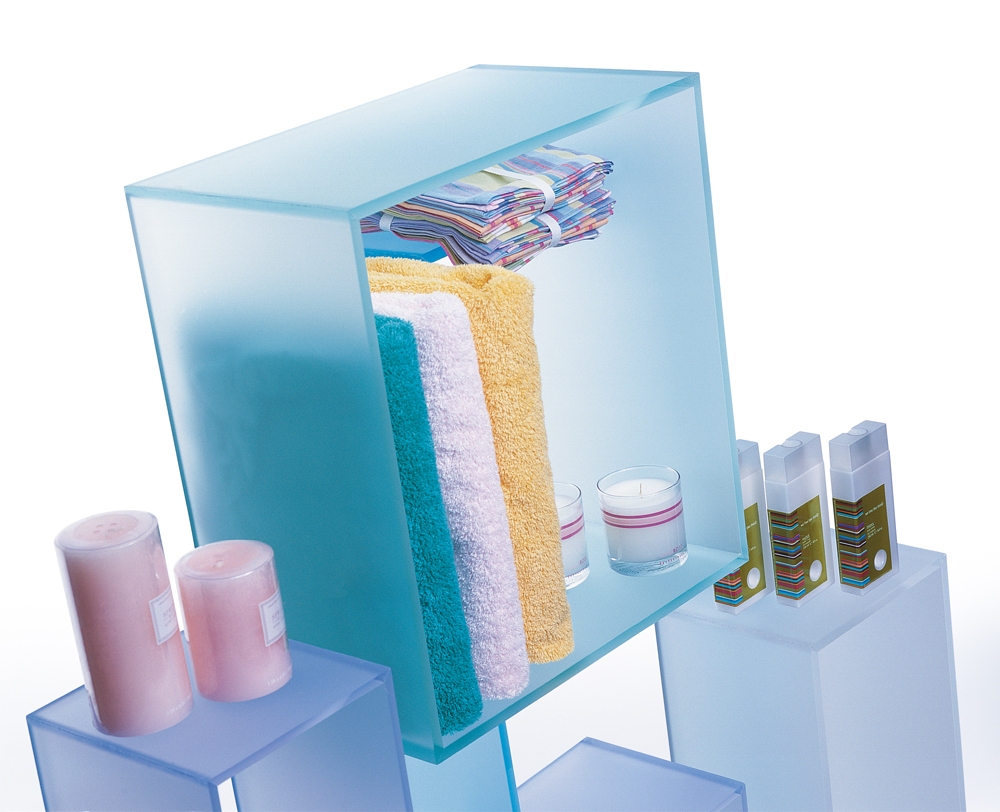 Acrílico frost nas duas faces com acabamento mate, semelhante ao vidro fosco.